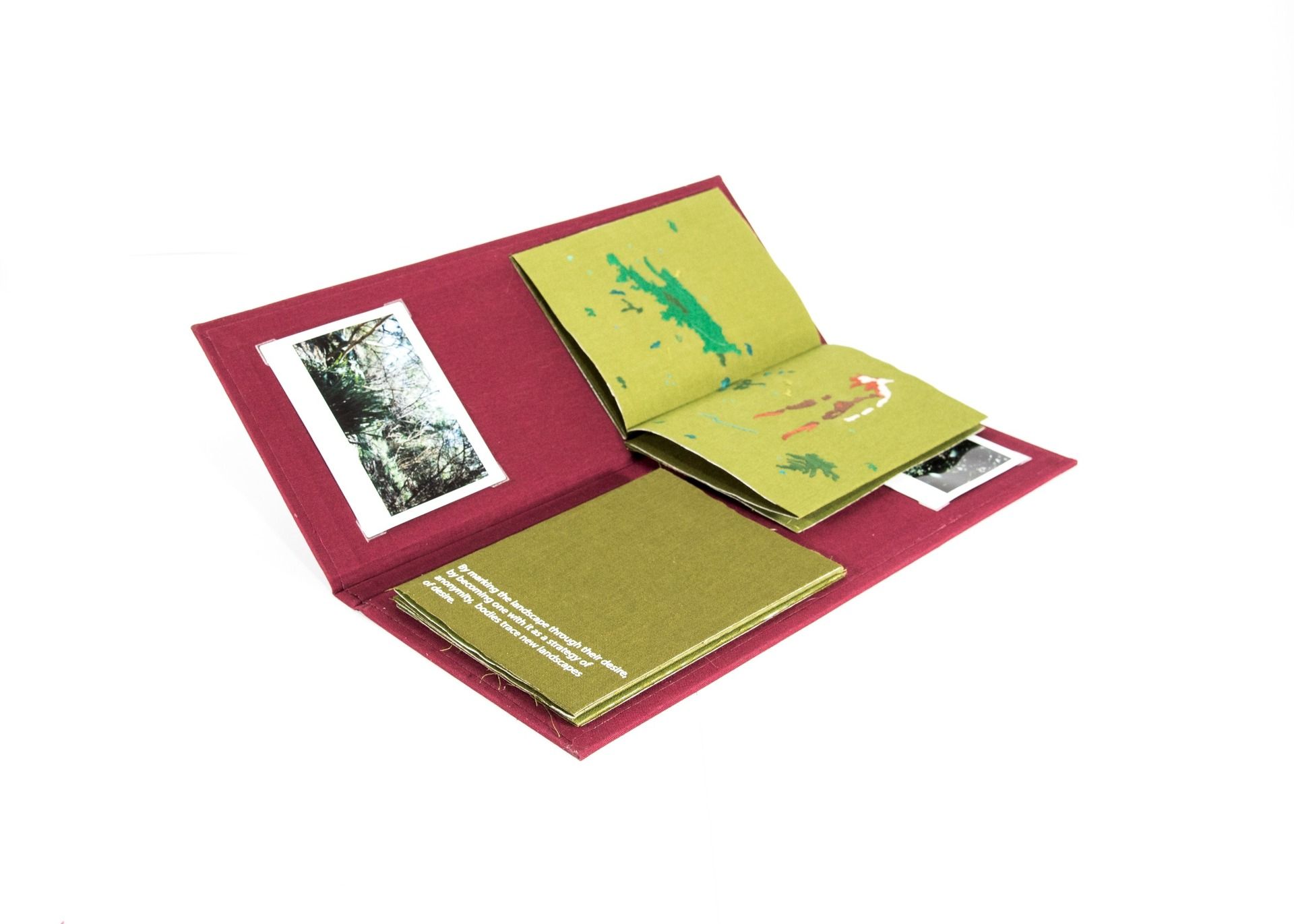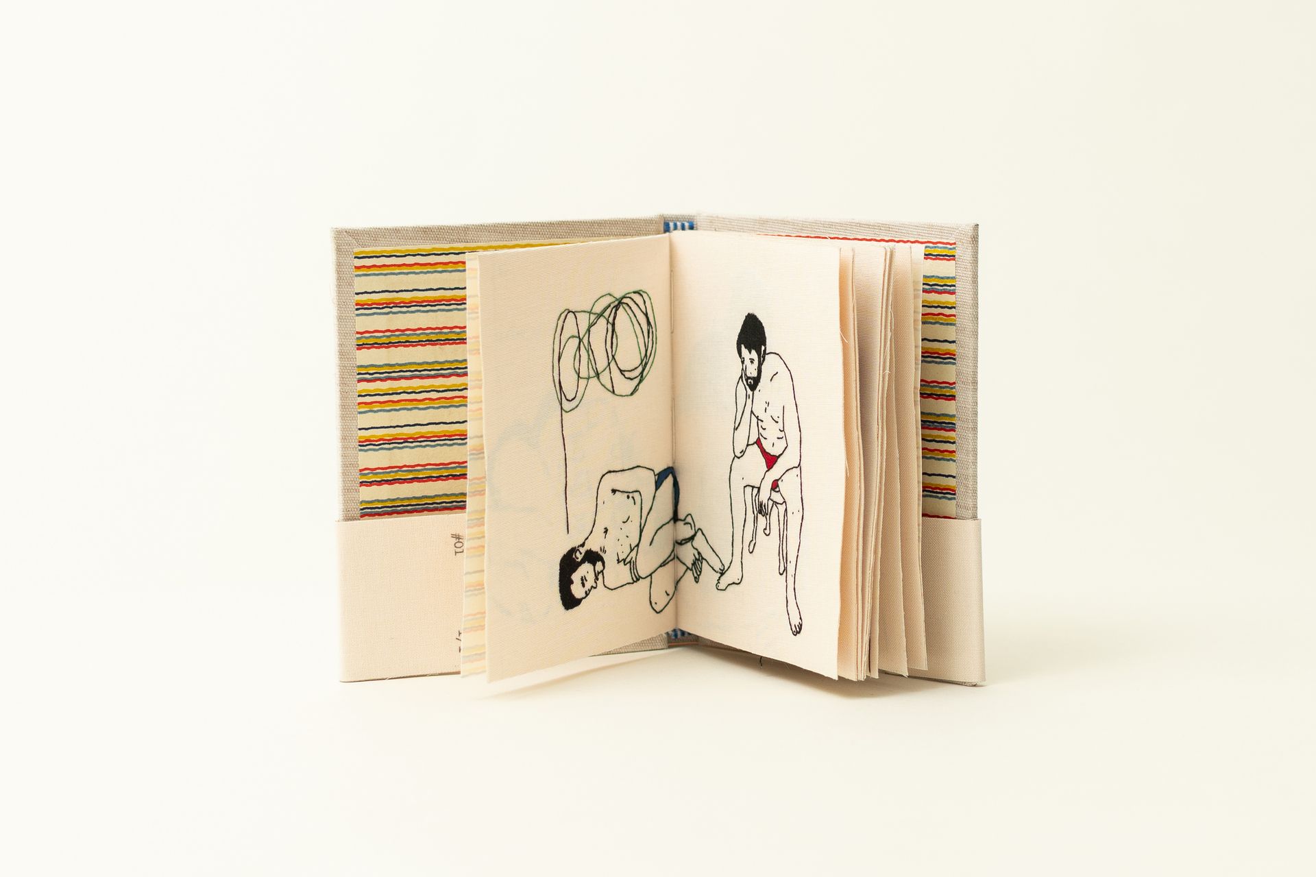 This hand-embroidered artist’s book explores cruising not as a fleeting act, but as a slow, embodied way of knowing and transforming space. Through thread and texture, the work dissolves the boundaries between body and landscape—rendering both as anonymous, porous shapes open to tactile exploration. Each stitch traces a moment of encounter, of presence without identity, where the contours of desire blur into terrain. The pages unfold like a map of gestures: fragmentary, intimate, and mutable.
