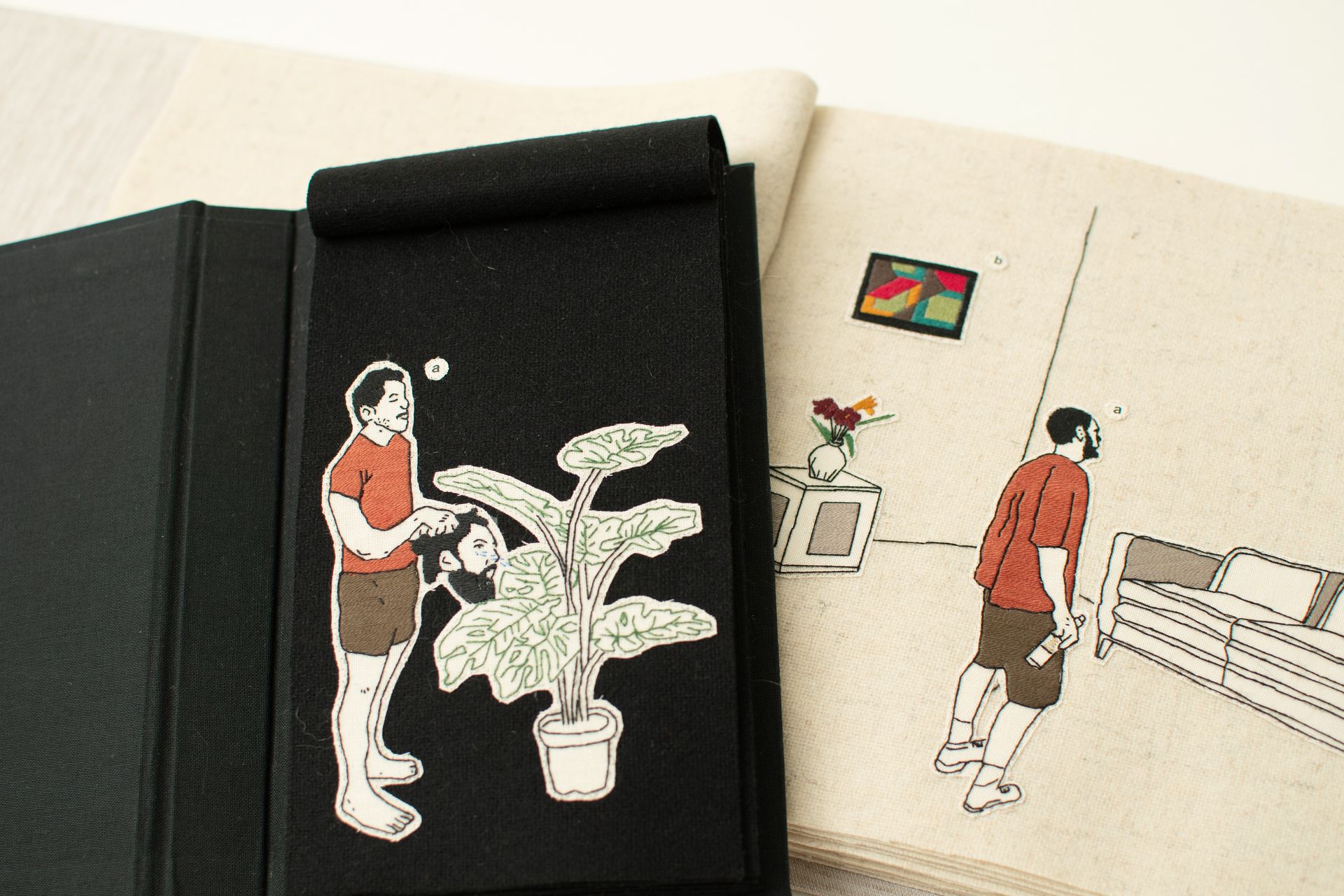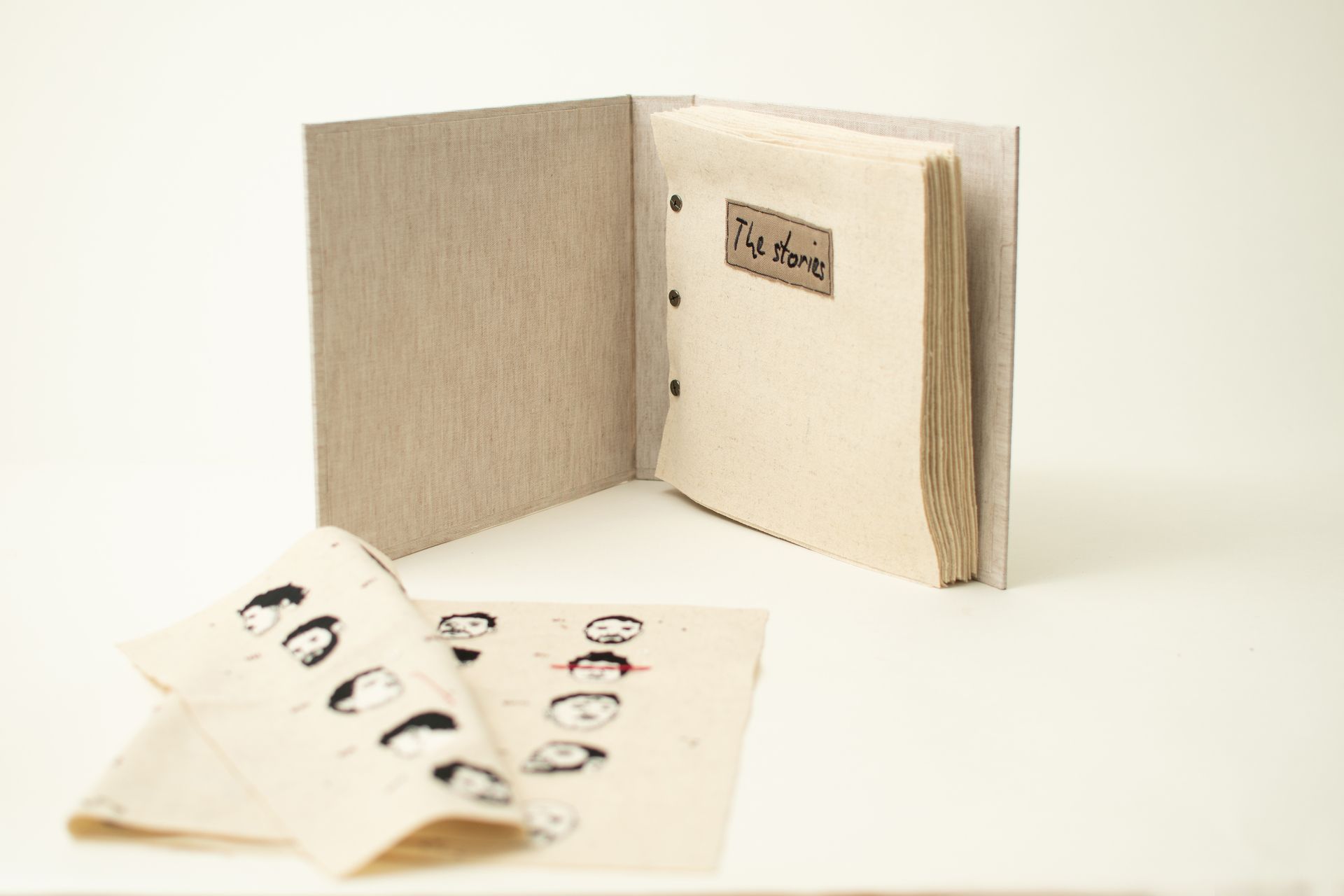 The Stories: 20 hand-embroideries on beige wool, hand-bound, 26cm x 22.5cm